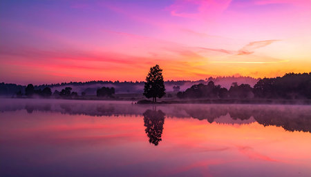Reflection silhouette of a lone tree in a calm lake, sunrise colors painting a serene and contemplative scene