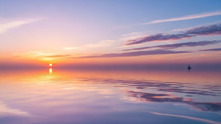 A serene sunset paints the sky with pastel colors reflected on calm water, with a small sailboat visible on the distant horizon.
