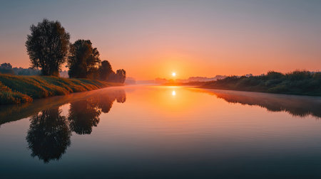 A breathtaking view of a sunrise casting a warm orange glow over a tranquil river, perfectly reflecting surrounding trees and serene skies in the morning light.