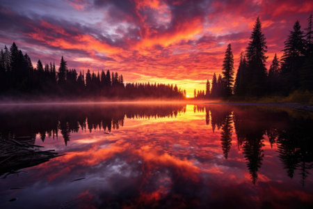 The image showcases a serene lakeside scene at dawn, with trees silhouetted against a vibrant, colorful sky. The composition emphasizes symmetry and reflection, with the trees mirroring in the calm water. The warm hues create a tranquil and natural environment.