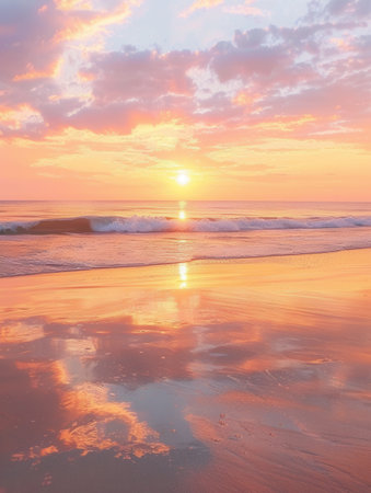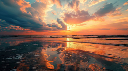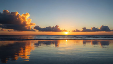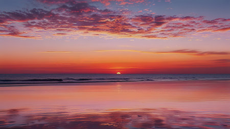 A breathtaking sunset casts vibrant hues across the calm ocean, reflecting beautifully on the water's surface. Clouds frame the peaceful scene, creating a serene atmosphere.
