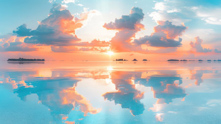 The image showcases a sunset with dramatic clouds reflecting in still water. The scene is dominated by hues of orange, blue, and yellow. The style is soft, with a focus on natural light and a symmetrical composition. This image could be used for various purposes, including travel promotions or artistic projects.