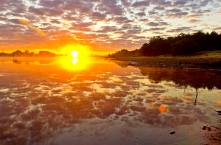 Beautiful summer landscape with tranquility sunrise over the river with haze