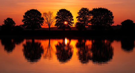 Stunning sunset reflected on a calm lake, silhouetted trees.