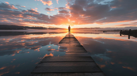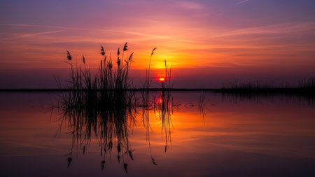 A breathtaking sunset paints the sky with hues of orange pink and purple reflecting serenely on the tranquil water surface.