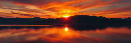 A breathtaking sunset casts warm colors over tranquil waters, reflecting serene mountains. This captivating landscape evokes peace and beauty in nature.