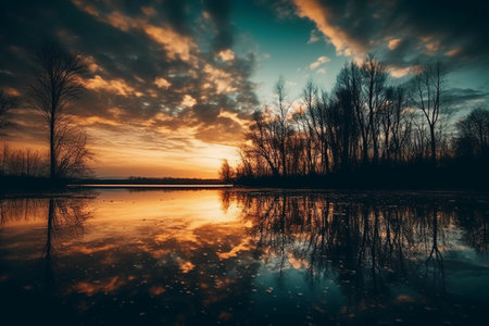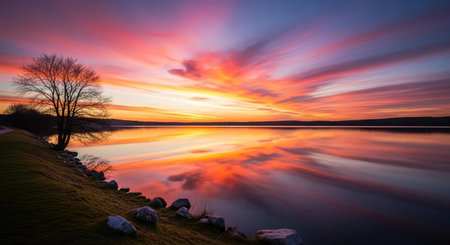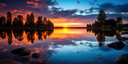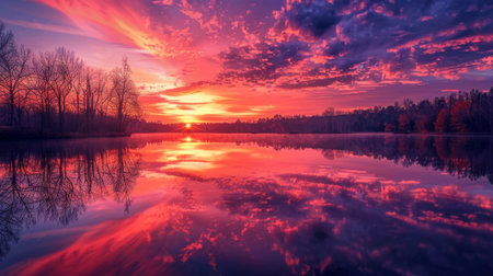 Golden Hour Serenity A Tranquil Lake Reflects a Vibrant, Colorful Sunset with Silhouetted Trees