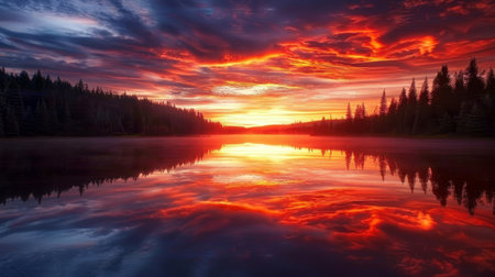 A vibrant sunset sky reflected in the calm waters of a lake, with the landscape perfectly mirrored.