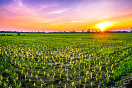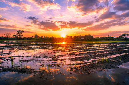 Beautiful sunset over paddy rice field in countryside of Thailand.