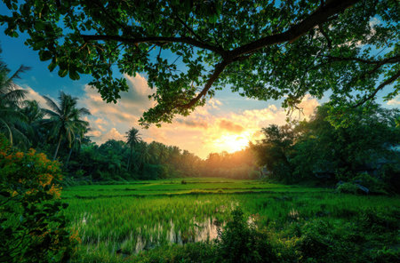 Lush green rice field, with trees framing a bright sunset. Sky, foliage, & palms included