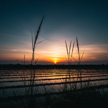 A field of rice paddies reflecting the sunset, creating a stunning visual of agricultural beauty.