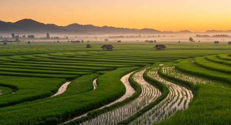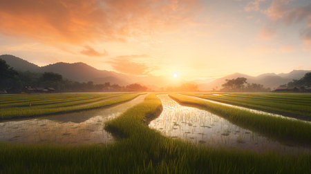 A serene rice field glistens with dew at sunrise, highlighting the beauty of nature. This tranquil landscape evokes feelings of peace and growth.