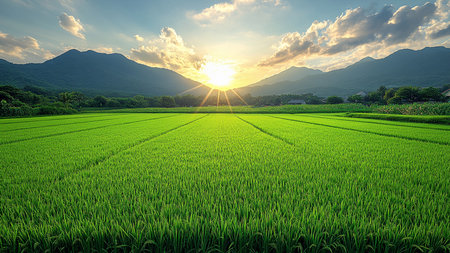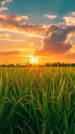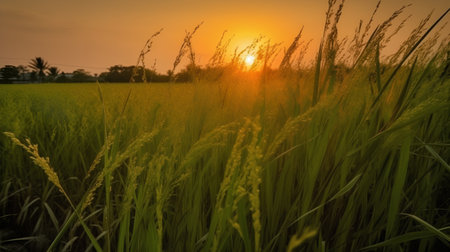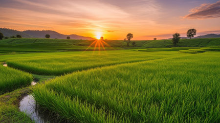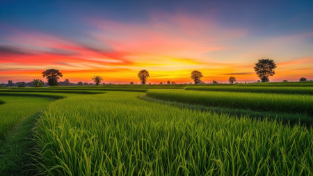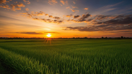 A Picturesque view of rice field at sunset with vibrant green plants