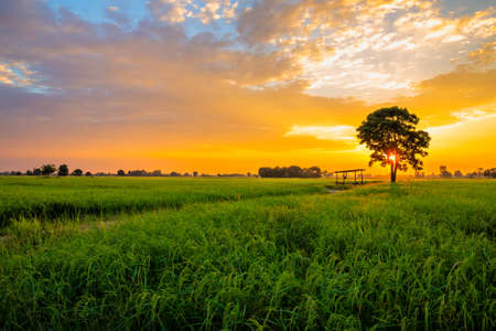 Growth rice field under beautiful sky in sunset with sillhouette lone tree and farmer's shelter hut