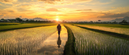 A farmer walks through rice paddy field reflecting sunset hues, creating serene atmosphere