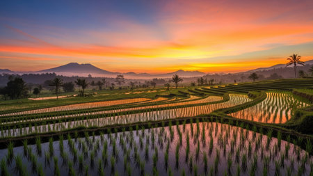 A Peaceful rice terrace landscape with stunning sunset backdrop
