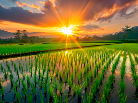 Vibrant sunrise over lush green rice fields in a tropical landscape.