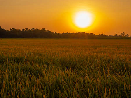 Beautiful sunset over the rice field in the countryside of Thailand.