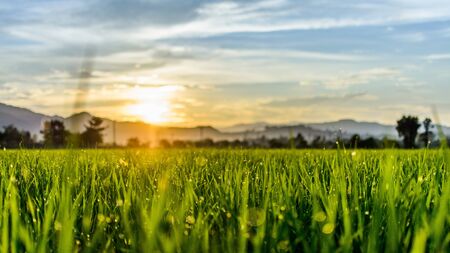Green rice field with sunset and mountain in the background, Nature landscape
