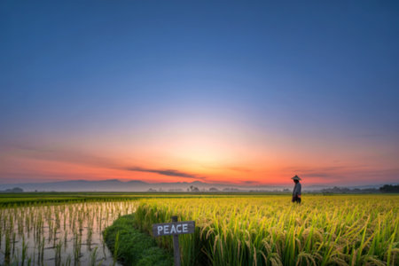A lone farmer stands in a vibrant rice paddy at sunrise, a simple 'Peace' sign marking the scene. The tranquil atmosphere is enhanced by the soft light and distant mountains.