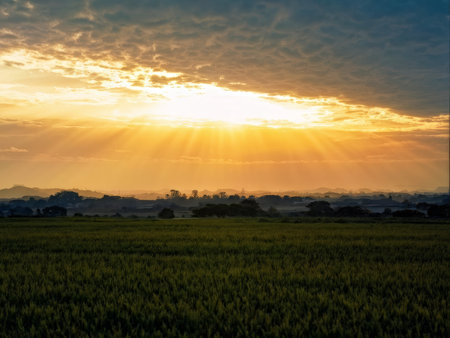 Sunset over rice field with vibrant colors and mountain backdrop creates serene atmosphere