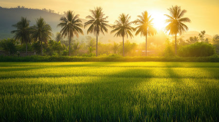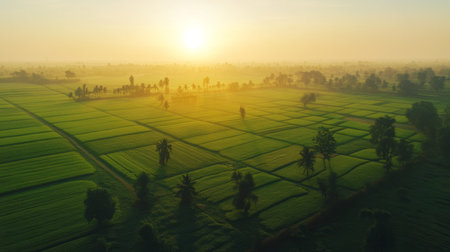 A stunning view of a serene sunrise illuminating a vast green rice field, surrounded by gentle mist and a colorful sky, evoking tranquility and beauty.