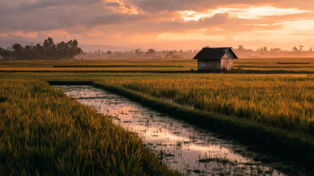 A tranquil rural landscape featuring vibrant rice fields at sunrise. A small house sets the scene, surrounded by lush greenery and tranquil water reflections.