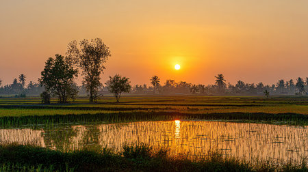 A stunning sunrise casts vibrant colors over a tranquil rice field. The reflection in the water creates a scenic view, with silhouetted trees adding charm.