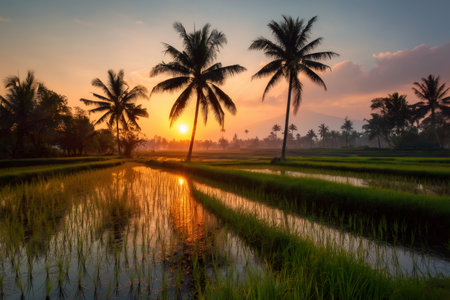Golden sunlight illuminating flooded rice paddies and swaying palm trees, creating a serene tropical landscape in Bali, Indonesia