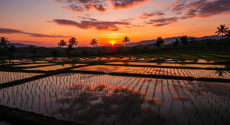 A stunning sunset illuminates serene rice terraces, reflecting vibrant colors on the water. The scene captures a peaceful rural landscape in tropical mountains.