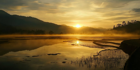 Sunset showing expansive terraced rice paddies reflecting golden sunset light creating a agricultural landscape with rolling hills and mist. resolution