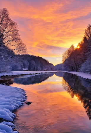 Vibrant winter sunset casts brilliant colors above a frozen river, reflecting a serene and peaceful snowy landscape. Nature's stunning artwork unfolds.
