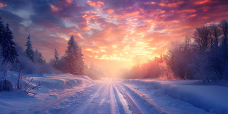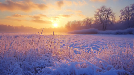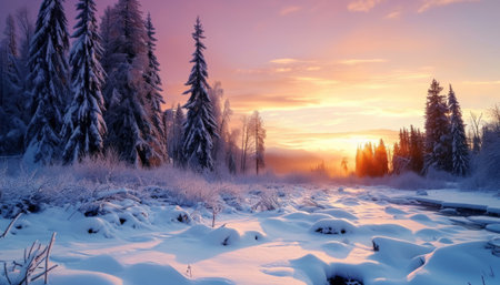 Stunning winter sunset scene with a frozen river and snow-covered trees. Serene and peaceful atmosphere.
