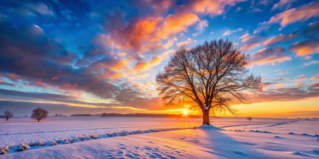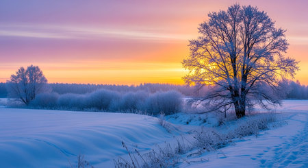 Beautiful winter landscape with snow-covered fields and trees at sunset