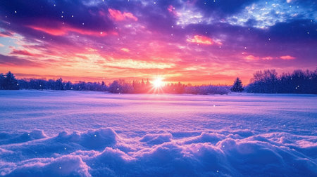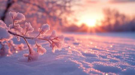 A winter sunrise over snow covered landscape, sparkling snowflakes