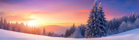 Beautiful winter landscape with snow covered trees and sunset. Panorama