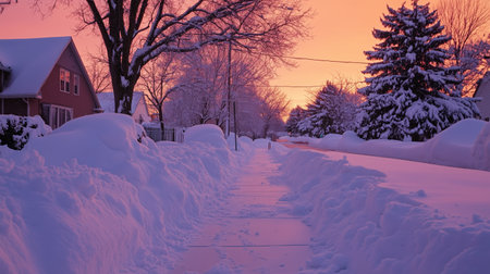 A picturesque snowy street at sunset in a quiet residential neighborhood during winter