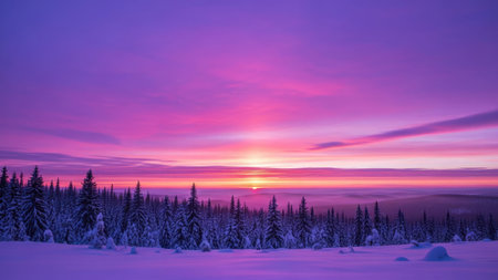 A winter valley unfolds under a vibrant purple and pink sunset, with snow-covered pine trees dotting the slopes.