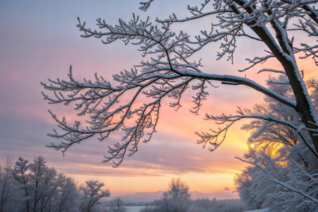Delicate branches dusted with fresh snow create a striking contrast against a vivid pink sky as the sun sets in a tranquil winter landscape.