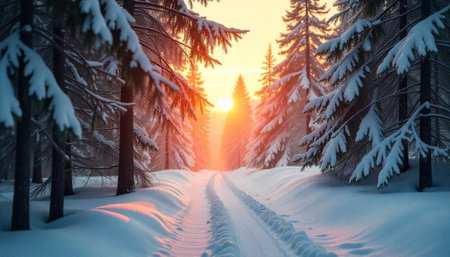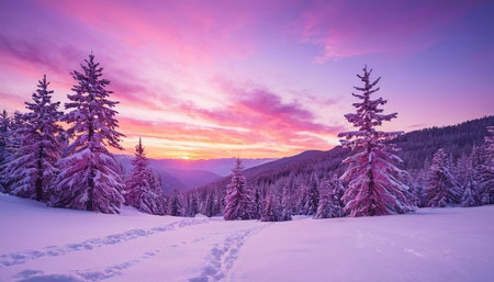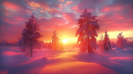 Experience the tranquility of a winter sunset illuminating a snowy landscape. Majestic evergreen trees stand proud against a colorful sky, inviting peace.