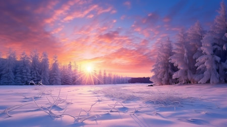 Beautiful winter landscape with snow-covered field and trees at sunset