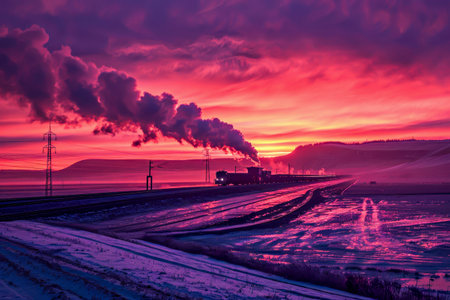 Expansive coal mining landscape during dawn. Vintage steam locomotive is traveling along track with billowing smoke rising against vibrant sunset sky, creating dramatic and picturesque landscape scene