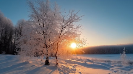 A serene winter morning in a snowy landscape with soft sunlight illuminating frost-covered branches. Generative AI