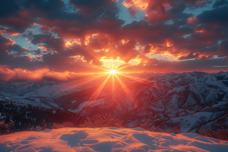 An AI generated illustration of A stunning winter sunset featuring a snow-covered mountain illuminated by the setting sun