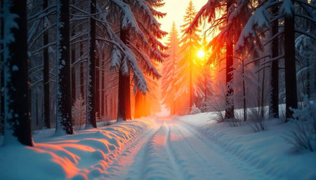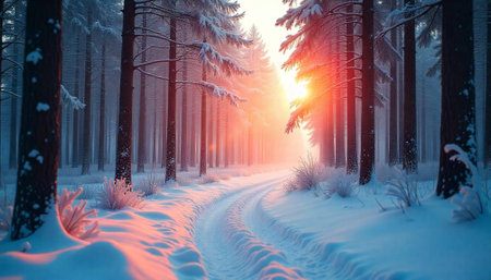 A snowy forest path leads through snow-laden trees under a vibrant sunset sky painted with pink and orange hues.