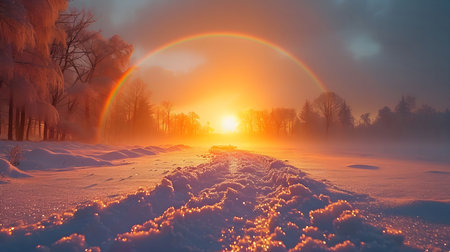 A breathtaking view of a snowy winter landscape with a vibrant rainbow arching over the setting sun. The scene is filled with a sense of peace and tranquility.