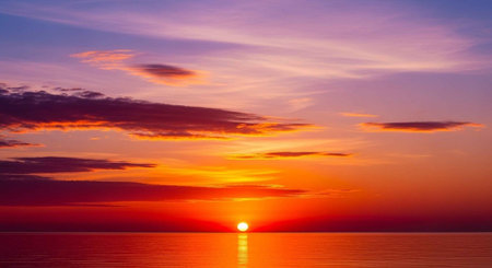 A serene sunset over a calm ocean with vibrant colors in the sky