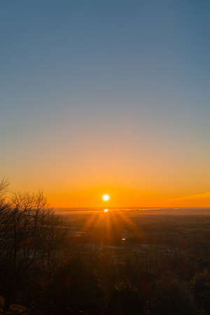 landscape sunset sunrise bright colors, beautiful sky with sun over silhouette of tree