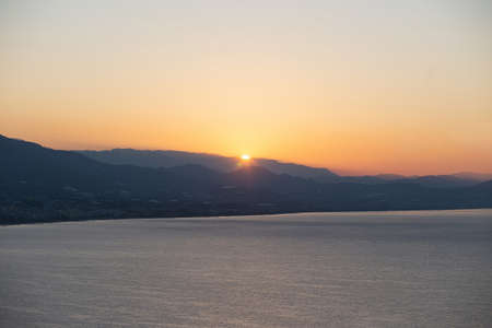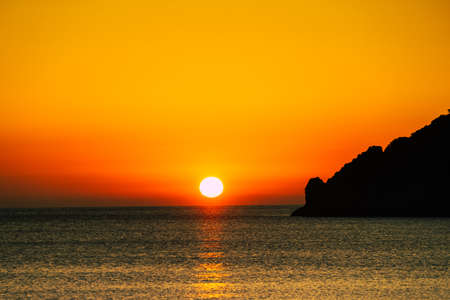 Bright sunrise with yellow sun under the mountains. Alanya, Turkey sunrise landscape background. Freedom travel concept