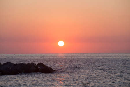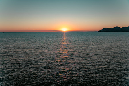 tunning sunset over the sea, along the coast of the Italian Riviera, with a magnificent display of orange, pink, and purple hues in the sky. The tranquil sea reflects the colors of the sunset, creating a breathtaking view.